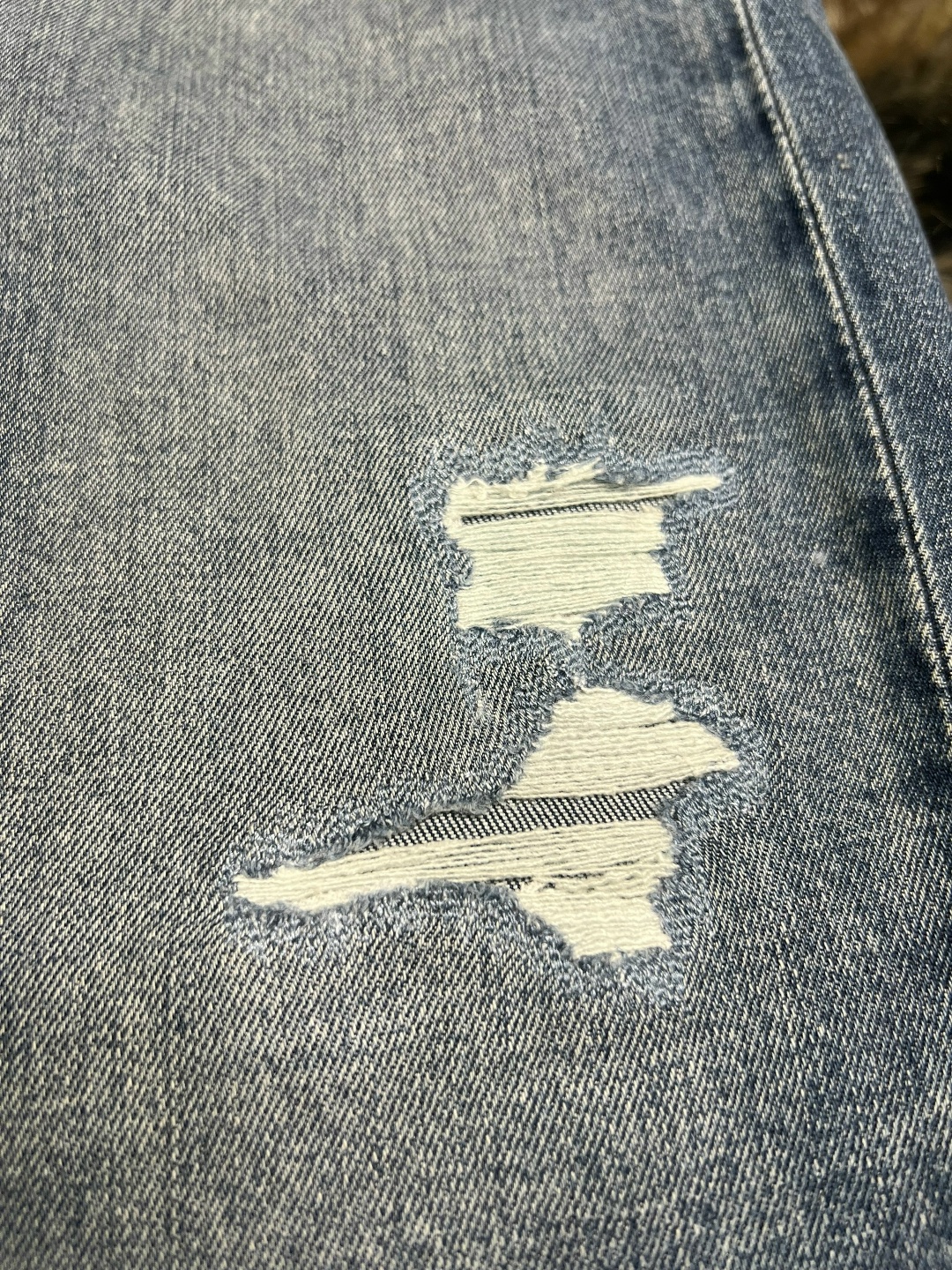 Волокна истончаются, и образуется дырка. Такие повреждения появляются: на внутренней стороне бедра, на коленях, по нижнему краю брючин, по краям передних карманов.
